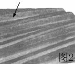 圖3中齒輪因?yàn)闈?rùn)滑油不足在重壓力下造成金屬與金屬直接接觸而產(chǎn)生刻傷。磨損表面上的水平線是節(jié)線(箭頭所示)。