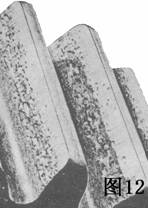 圖11中的麻點(diǎn)在螺旋面的外端(此圖中齒輪的右邊)開始,原因是中心線稍有失調(diào),麻點(diǎn)慢慢地向齒的中部進(jìn)展最后停止進(jìn)展,表面開始拋光,表示載荷沿齒面分配變得更均勻了.這種麻點(diǎn)是無害的。