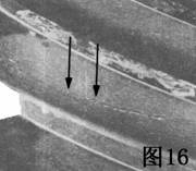 圖16滲碳層(硬化的表面)壓碎,表現(xiàn)在該錐形齒輪接觸表面上是縱長(zhǎng)的裂紋.主要的裂紋從滲碳層心部結(jié)構(gòu)的深處開始,慢慢向表面延伸。