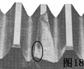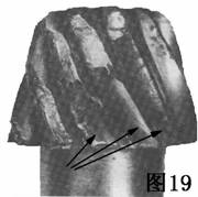 圖18是齒輪的典型疲勞缺陷,其特點(diǎn)是有光滑的地方.它是由重的載荷或震動(dòng)載荷(不正確的換檔和操縱離合器)造成的。