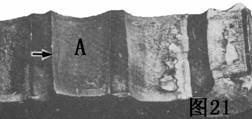 圖21是在齒輪的若干齒上,由于重復(fù)的重載荷引起的斷折的情況。標(biāo)有“A”字的齒看來是由于疲勞裂紋首先折斷的(注意光滑、似夭鵝絨般的地帶)。